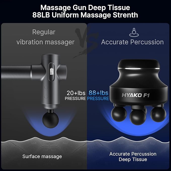 - Deep Tissue Massage Gun: HYAKO F1 massagers handheld deep tissue Power Performance - Brushless motor, large contact massage tools area. 6mm deep tissue massage that can quickly relieve muscles stiffness and pain, promote blood circulation, alleviate lactic acid, and enhance the ability of body cells regrowth and self-repair. The Professional Electric Back deep tissue muscle Massager for elite athletes