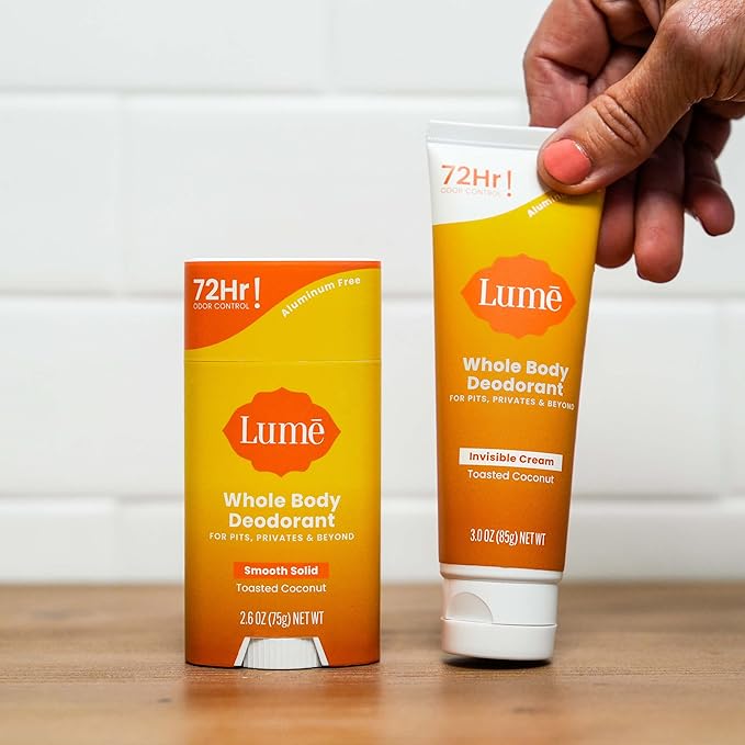 Lume Skin Care Gift Set for Women, Whole Body Deodorant Starter Pack -Smooth Solid Stick, Invisible Cream Tube, Acidified Body Wash Mini & Deodorant Wipes -Aluminum Free Odor Control (Toasted Coconut)