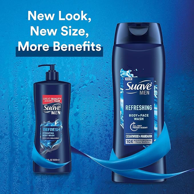 - New look and even more benefits! Work hard & smell great with the Suave Men Refreshing Face and Body Wash!