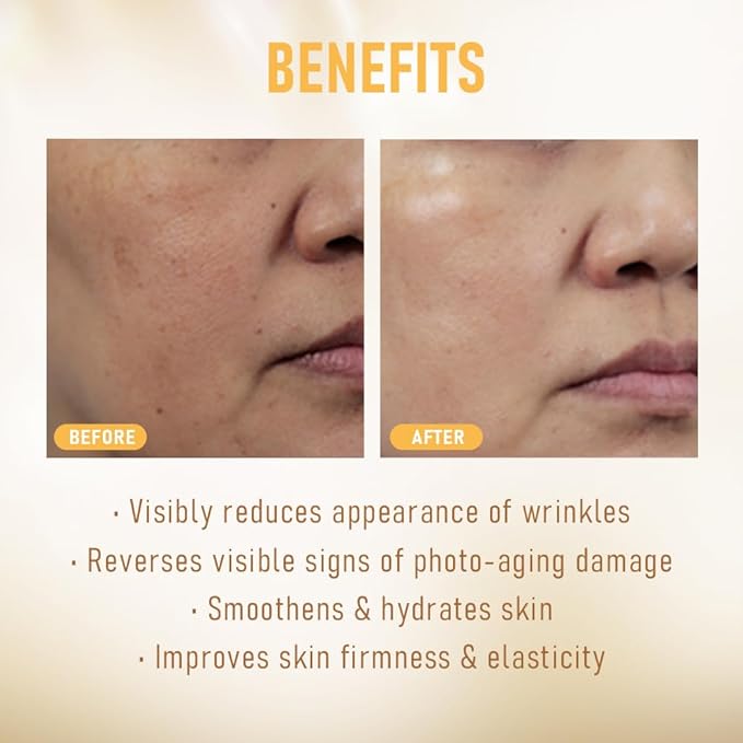 - 9 Gold Complex Peptide: 24K gold encapsulated with wrinkle reduction technology of 9 peptides, fast absorbing and deeply penetrating into the epidermis strengthening tissues, promoting the rejuvenation process. It improves skin smoothness and firmness; decrease the appearance of wrinkles over time.