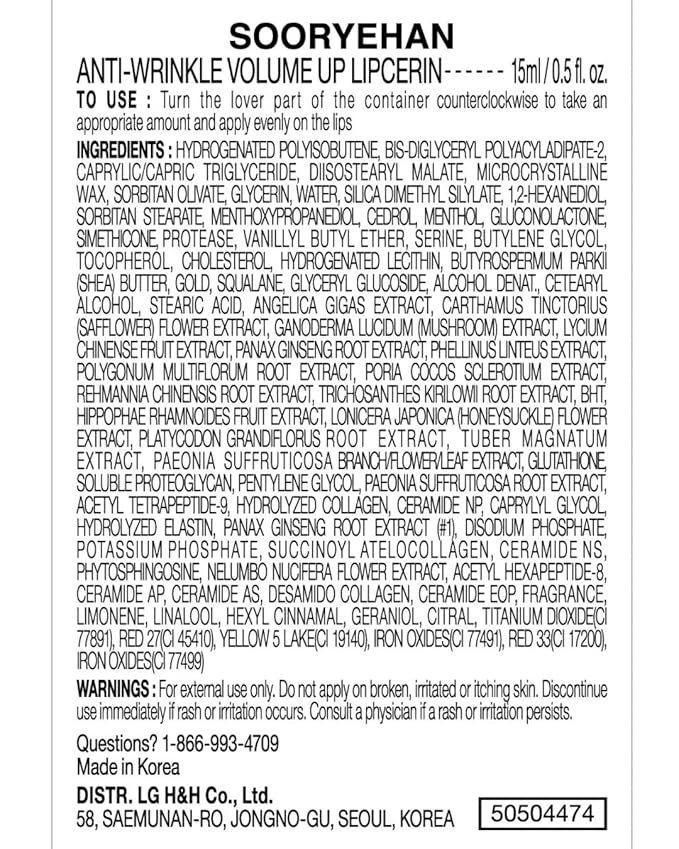 - SOORYEHAN VOLUME UP LIPCERIN (15ml/0.5fl oz) - Elevate your lip care routine with Lipcerin, a ground breaking fusion of "lips" and "glycerin" from Sooryehan. This innovative formula not only gently exfoliates your lips but goes a step further, providing deep nourishment for volumized, youthful-looking lips.