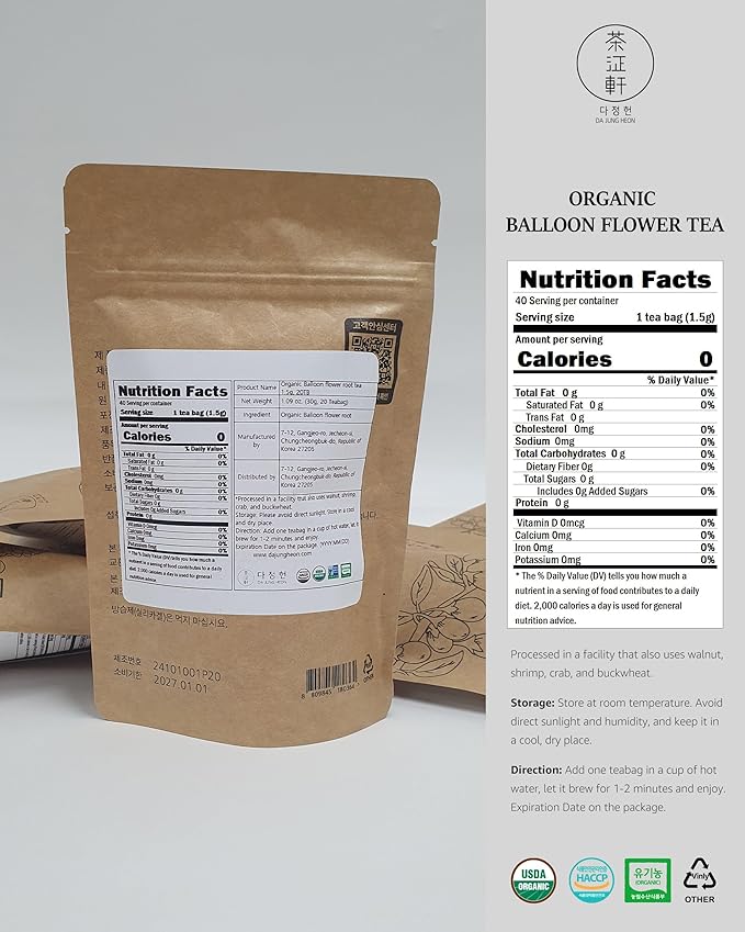 - USDA-CERTIFIED & ORGANIC INGREDIENTS FROM KOREA: Every tea from DAJUNGHEON is certified USDA organic. BALLOON FLOWER ROOTs. It is free from additives, preservatives, and sulfites. It contains only the purest BALLOON FLOWER ROOTs organically grown in Korea. You can confidently savor your tea time with USDA-certified, non-GMO tea.