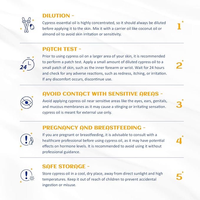 • Safer: Our cypress oil is distilled from the Spanish cypress trees' fresh leaves and berries. Toxin-free, additive-free, unfiltered, and undiluted. Tested for purity and composition by GC/MS, MSDS, COA, IFRA and more