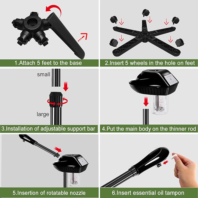- The facial steamer wheels is adjustable from 36-52 inches in height and the nozzle rotates 360°, allowing you to enjoy spa treatments while lying down or sitting down, and the removable five-legged base has 5 silent wheels for smooth and quiet movement