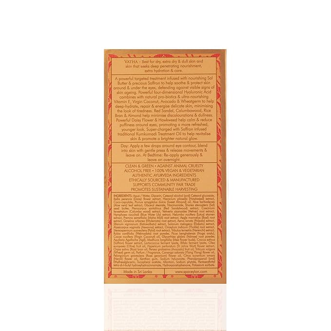- Kumkumadi Oil for Radiance - Infused with the traditional Ayurvedic Kumkumadi Treatment Oil, renowned for revitalizing skin, this concentrate illuminates your eye area, enhancing its natural glow.