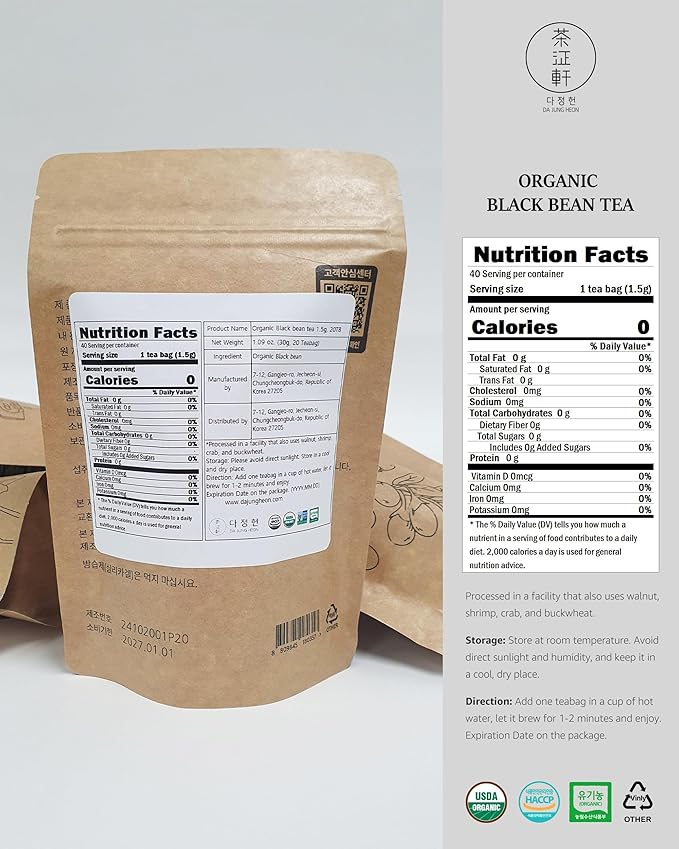 - USDA-CERTIFIED & ORGANIC INGREDIENTS FROM KOREA: Every tea from DAJUNGHEON is certified USDA organic. Black bean (Korean) It is free from additives, preservatives, and sulfites. It contains only the purest rosted barley organically grown in Korea. You can confidently savor your tea time with USDA-certified, non-GMO tea.
