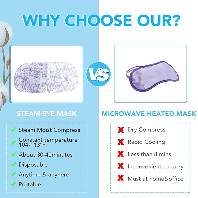 - 【Upgrade Steam Eye Mask】The self heating steam eye mask is made of high-quality cotton non-woven fabric, which is comfortable and skin friendly, fits the eyes well, and effectively reduces problems such as dryness, swelling, and dark circles under the eyes. Steam eye masks can release warm steam, promote blood circulation in the eyes, quickly relax eye muscles, and make the eyes glow naturally.
