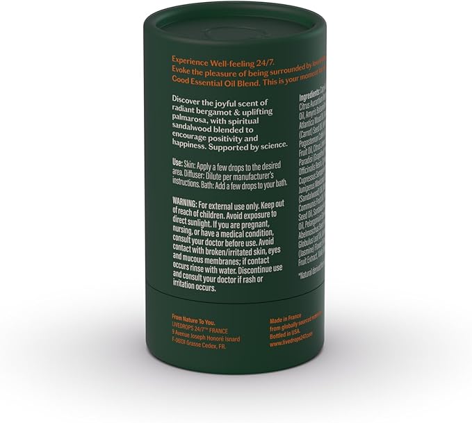 LIVEDROPS 24/7 Good Essential Oil Blend - Bergamot, Palmarosa & Sandalwood – Natural Aromatherapy for Positivity & Focus – Crafted in France by Perfumers – Skin-Safe & Diffuser Compatible