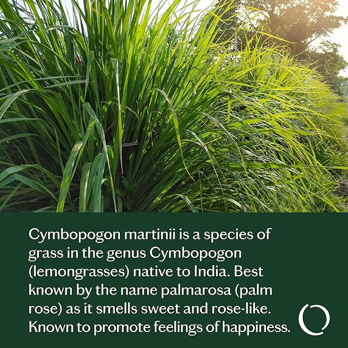 • Palmarosa (Cymbopogon Martini) Oil, native to India, is known as palm rose for its sweet, rose-like scent and is recognized for promoting feelings of happiness.