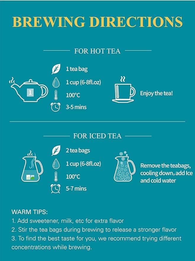- [100 COUNT ECO-CONSCIOUS TEA BAGS] - Our premium tea bags are made from non-GMO plant fiber, and tea bags are compostable. No string and no tag. No extra waste - just healthy & delicious tea!