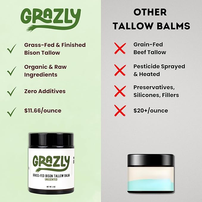 - Bison Tallow vs. Beef Tallow – A Nutrient-Dense Upgrade: While traditional beef tallow offers great moisturizing benefits, bison tallow is a step above, packed with more essential fatty acids and nutrients that promote deeper hydration and faster skin repair. This makes it a more potent option for those looking to enhance skin health and protection naturally. Bison tallow provides the ultimate nourishment for your skin, making it a superior choice for moisturizing, anti-aging, and skin rejuvenation.