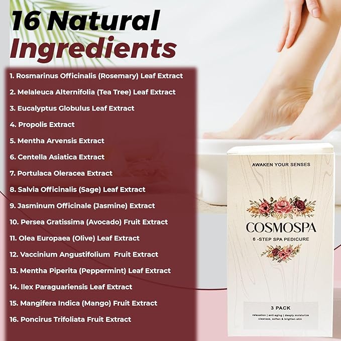 - Complete Six-Step System: Each CosmoSpa pedicure set includes six carefully selected components soak, scrub, mask, cooling gel, massage lotion, and finishing moisturizer to cleanse, exfoliate, and hydrate your feet for a luxurious spa experience.