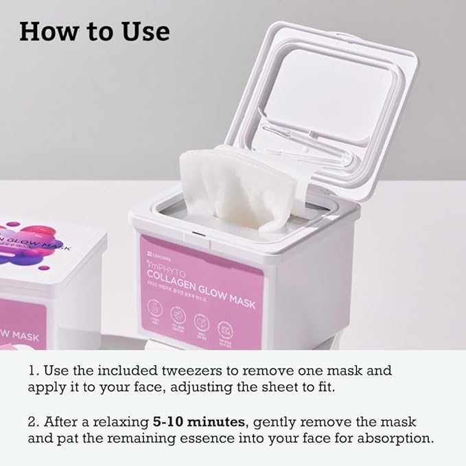 - CONVENIENT DAILY USE – The pull-out mask pack design simplifies your daily skincare routine, with a compact container for easy storage. Collagen Glow Masks are easy to use: Gently unfold and apply mask to clean, dry skin. Smooth out mask to ensure close skin contact and leave on for 5-10 minutes. Remove mask and pat in any remaining essence until fully absorbed. Use 1 sheet per day for maximum benefits. Transform your skincare routine into a revitalizing experience with our Collagen Glow Mask.