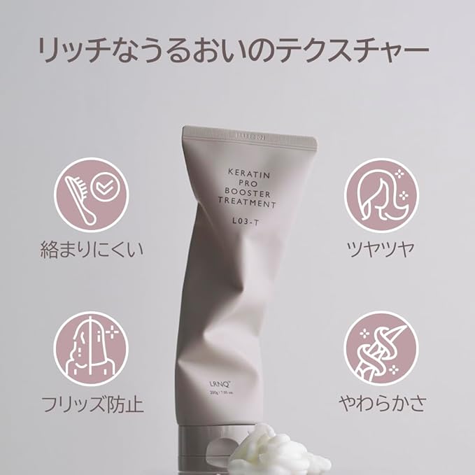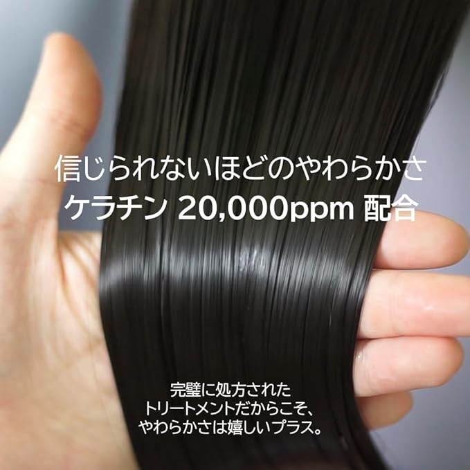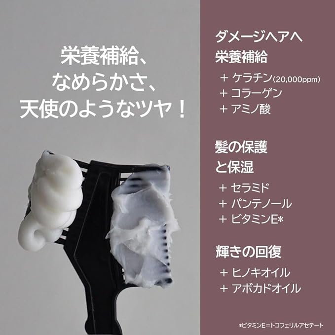 - 20,000 ppm of low-molecular keratin adsorbs to the hair, giving it an essential hair clinic effect. And, 6 types of low-molecular proteins, including 20 amino acids and keratin, give hard durability to hair, and ceramides, panthenols, and naturally derived oils give elasticity and shine.