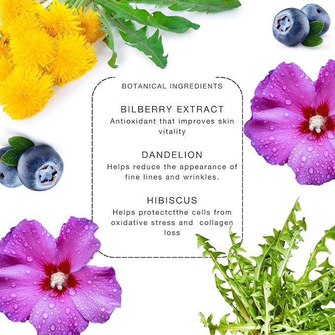 - MADE WITH BOTANICAL AOX (antioxidant) BLEND: Hibiscus, Bilberry, Pomegranate, Picea Abies and Dandelion extracts are known for their skin protective antioxidant, brightening and circulation promoting effects