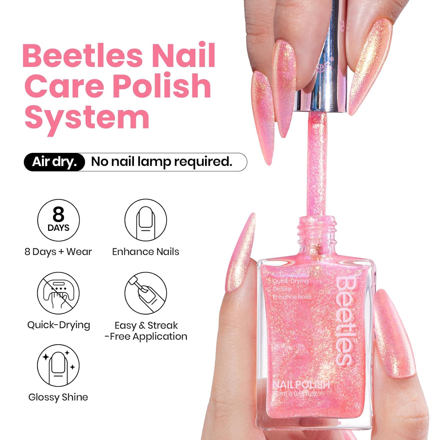 Beetles Pink Nail Polish - 15ML Quick Dry Nail Polish Glitter Gold Pink Nail Lacquer Shimmer Fingernail Polish Art Effect for Nail Salon-Quality