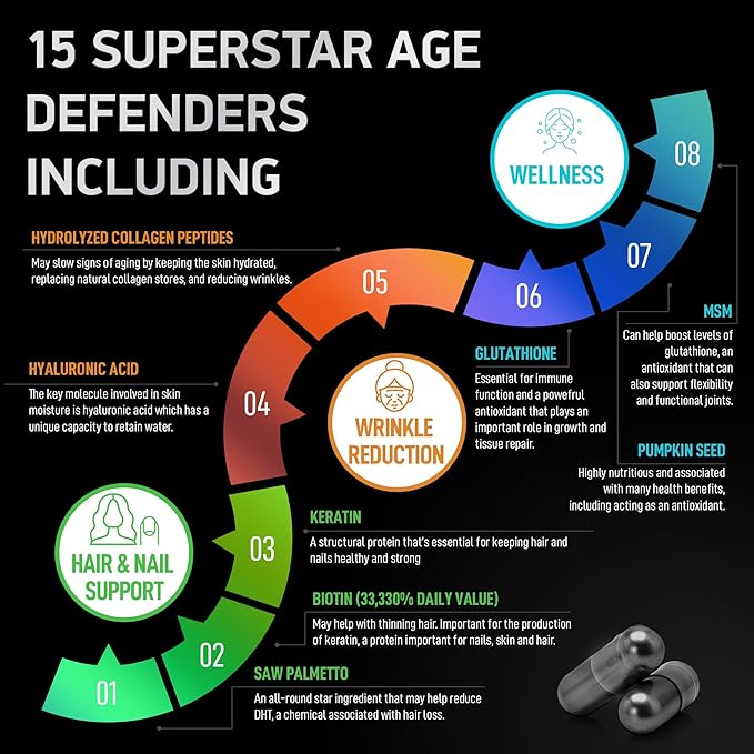 - Age Defense Beauty Collagen Matrix - Biotin Collagen Keratin Supplement DHT Blocker - 1,000mg Hydrolyzed Multi Collagen Complex, Saw Palmetto, Hyaluronic Acid, Vitamin C - 90 Gluten-Free, Non-GMO Caps