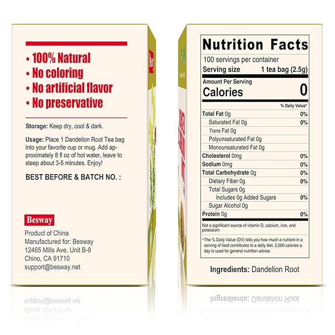 - 【Convenient and Fresh】With 100 individually packed tea bags in pouch, you can enjoy a fresh cup of dandelion root tea anytime. Each bag is designed for convenience and maintains freshness from the first to the last brew.