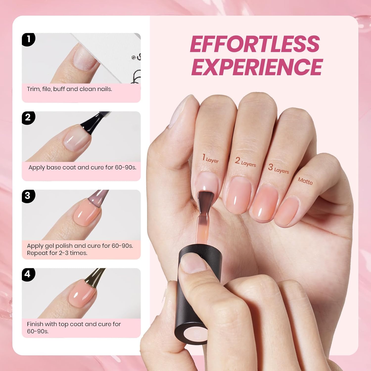 - 【Sheer Jelly Gel Styles】Apply several layers to build up the color from clear translucent to solid opaque. Each layer, whether one, two, or three layers, creates a different effect. The jelly gel and cat eye gel is UV gel and need to be cured 60-120s.