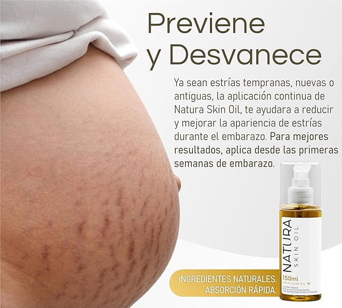 - Natura Skin Oil provides a natural and effective solution for deeply hydrating the skin and reducing the appearance of stretch marks and scars. Formulated with high-quality natural ingredients, this non-greasy body oil nourishes the skin, leaving it soft, toned, and with a more youthful appearance. Ideal for use before and after pregnancy, its gentle fragrance and fast absorption make it perfect for daily skincare.