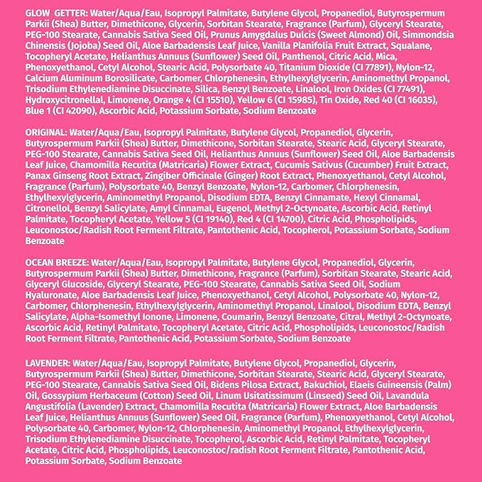 - Four Travel Size Lotions: Mini Original, Mini Ocean Breeze., Mini Glow Getter, Mini Lavender & Chamomile.