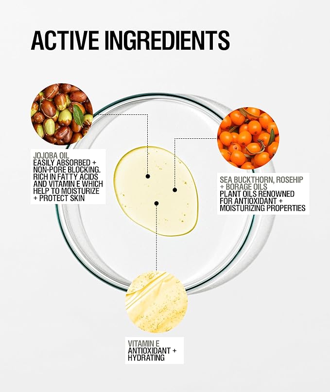 - FACIAL SERUM. Formulated with Vitamin E, Rosehip, Borago and Sea Buckthorn. Skin feels resilient, hydrated and soothed. Highly nourishing facial oil with skin renewal benefits. Suitable for all skin types.