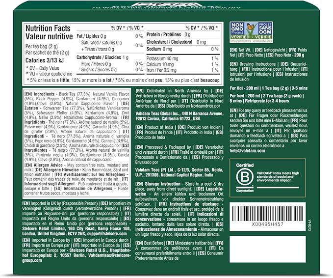 - 100% REAL INGREDIENTS - Each tea bag contains Black Tea blended with Cinnamon, Cloves, Cardamom, Black pepper and Extracts of Cappuccino and Vanilla. This specialty blend features an enveloping note of vanilla along with subtle hints of aromatic spices. Distinctly woody and earthy, the liquor feels ample in the mouth.