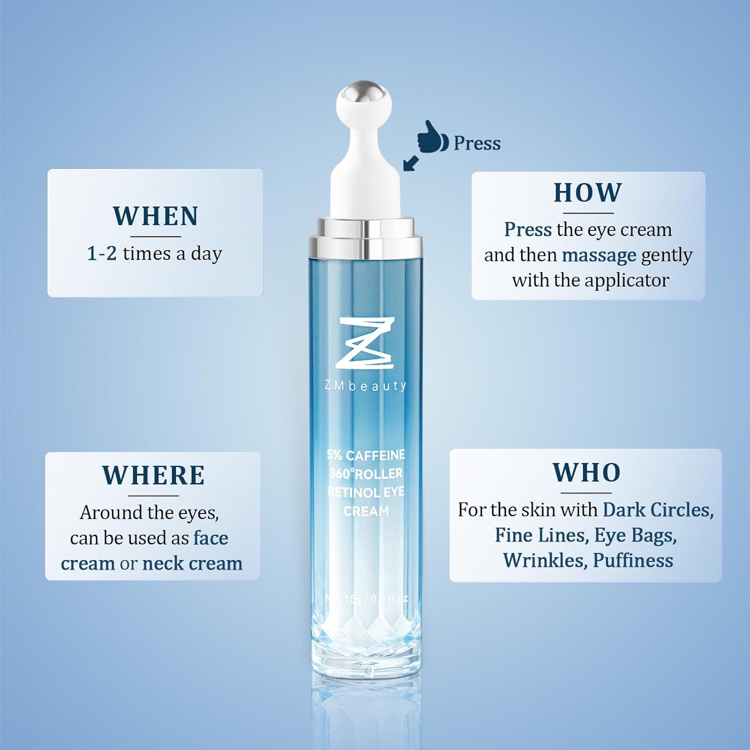 Under Eye Cream with 5% Caffeine, Dark Circles Under Eye Treatment with Retinol, Anti Aging Eye Serum with 360° Massage Roller for Eye Bags, Wrinkles and Puffiness, 0.5 fl. oz
