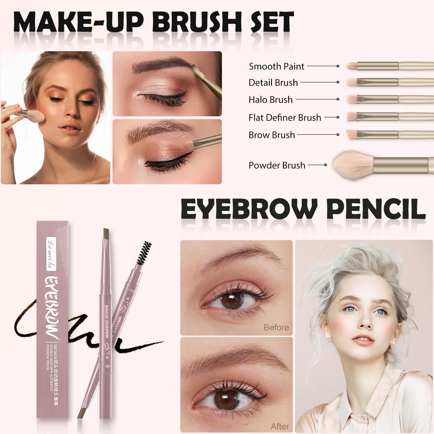 - 💄ALL IN ONE MAKEUP KIT FOR GIRLS - 1 x 10 colors cement, multi-purpose eyeshadow palette, 1 x waterproof and smudge-shield mascara, 1 x waterproof and smooth liquid eyeliner(friendly to newers), 1x peach colong matte lip gloss, 1 x 6pcs Soft Makeup Brush Set. 1 x brown eyebrow pencil. The simple make up set is perfect for makeup artists or starters & beginners achieving a full-face flawless, natural & nude eye makeup effect.