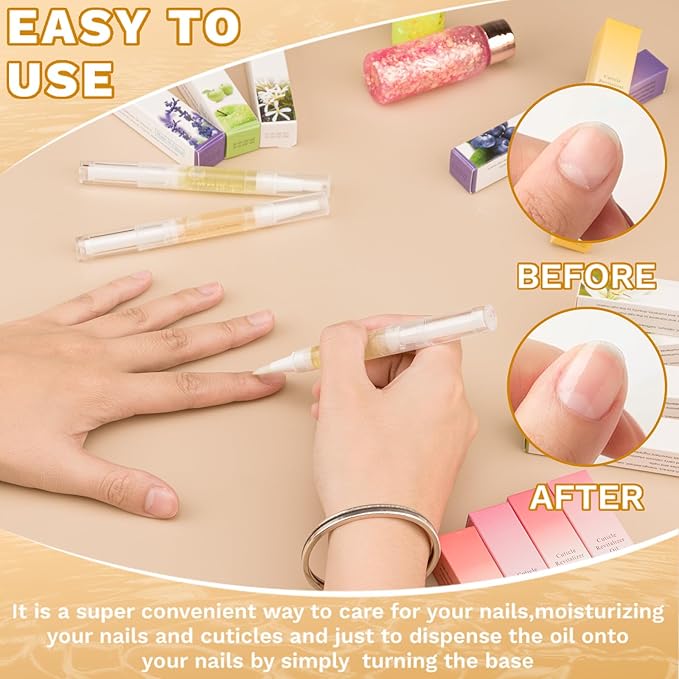 - 【Easy To Use】 - For first time use, keep clockwise twisting the grip of the nail polish tube and wait for 1-2 minutes until the polish drips off.Brush the oils onto your cuticles and the surrounding skin.Gently massage,3-4 times a week.Note: Cover the cap after use.