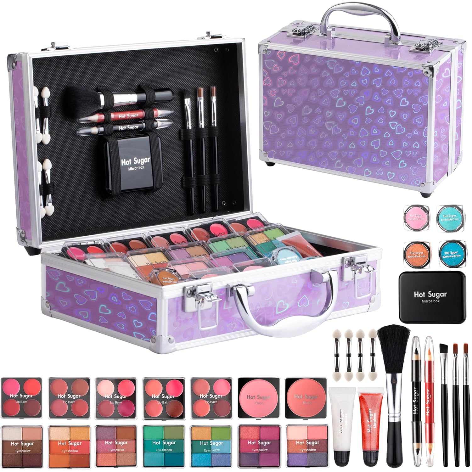 Hot Sugar Makeup Kit for Teenager Girls - Full Starter Cosmetics Set with Eye Shadow Lip Balm Blush Lip Gloss Brush Lip Pencil Eye Pencil and Mirror (Purple Love)
