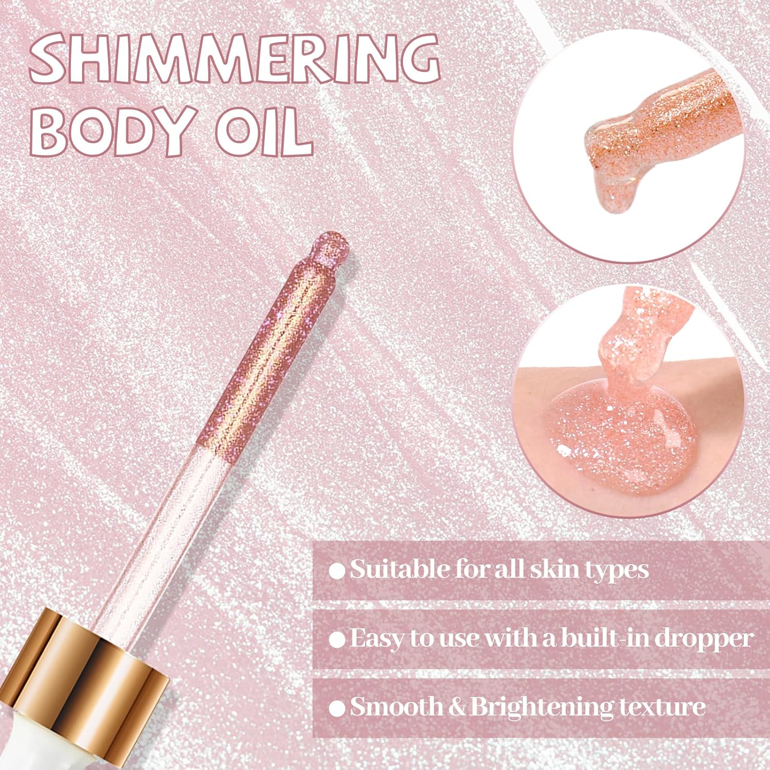 - [Shimmering Body Oil]:This shimmering body oil will brighten your skin and give your face and body a healthy glow, it will brighten and moisturize the face, body and hair. Suitable for any occasion and all makeup. This highlight oil is available in three colors: pearl white, rose gold and gold.