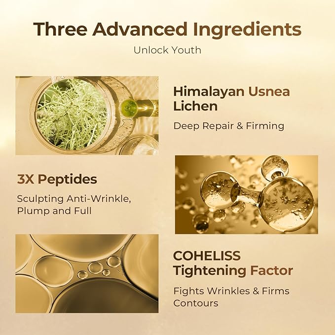 - ANTI-AGING KEY INGREDIENTS: Himalayan Usnea Lichen deeply repairs, firms the skin, and counteracts extrinsic aging factors. Triple Peptides help sculpt facial contours, smooth wrinkles, and enhance plumpness. COHELISS rye seed extract acts as a tightening agent, targets deep lines, boosting skin elasticity and defining facial contours. Squalane, jojoba esters, hyaluronic acid, niacinamide repair hydrate and moisturize the skin. Tranexamic acid helps to make the skin brighter and more luminous.