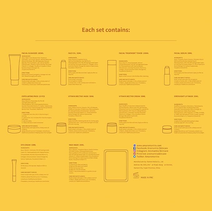 - 【Daily Skin Care Kit】Our vitamin C skin set includes 100ml Facial Cleanser, 50ml Leave On Night Mask, 150ml Toner, 30ml Face Oil, 30ml Night Serum, 15ml Eye Gel, 20ml Overnight Lip Mask, 50ml Face Cream, Face Mask, Exfoliating Pads(25 PCS) comes in a exquisite gift box, perfect for pampering your skin. All the vitamin C skincare products you need to reveal and maintain glowing skin