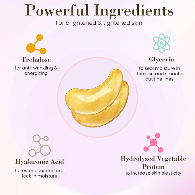 - REPAIR AND HYDRATION - Enjoy a luxurious spa-like experience in the comfort of your home! Eye mask is infused with hyaluronic acid and rich in moisturizing ingredients such as hydrolyzed collagen, 24K gold, plant extracts and vitamin E. It provides a large amount of moisture to the thirsty skin around the eyes. It can quickly penetrate into the muscle bottom, deeply Moisturize eye skin, improve dullness. It's non-sticky when use, srefreshing, gentle on sensitive skin.