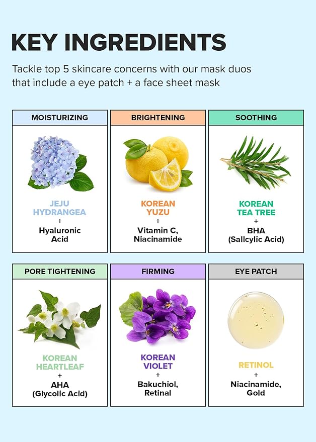 - ✅ Bye single-masking, Hi multi-masking! This multi-masking set features 5 unique mask duos, each pairing a brightening & revitalizing hydrogel eye mask with a full face sheet mask targeting one of 5 top skin concerns