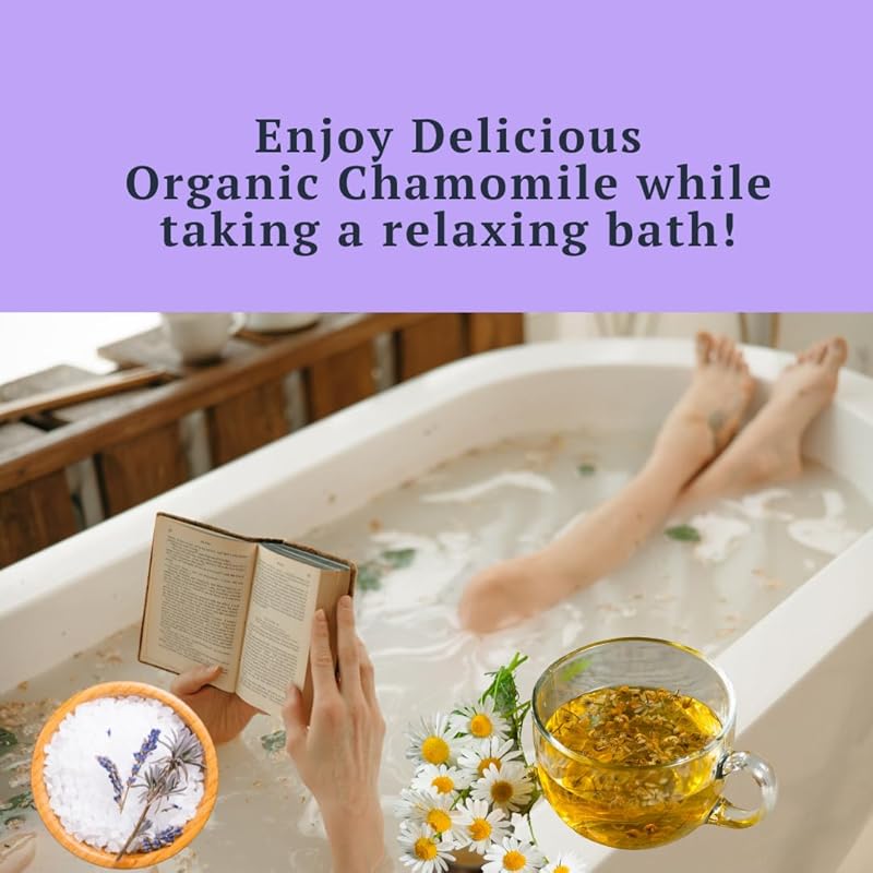 - ORGANIC CHAMOMILE TEA Sit back and enjoy our deliciously hand-blended organic loose tea! This caffeine-free will make the bath experience more enjoyable!
