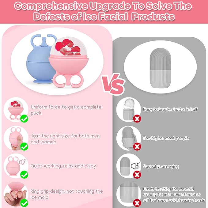 - 【FINGER RING & SUCTION CUP DESIGN】Compared to the traditional face ice, our ice face mould focuses more on protecting your fingers from frostbite during long time use, the difference is that we have an ingenious finger ring design which is more ergonomic. The bottom suction cup design enables the facial ice roller to be touched by mistake in the refrigerator freezer, it will not be tipped over as a result, effectively preventing water leakage due to tipping over when freezing