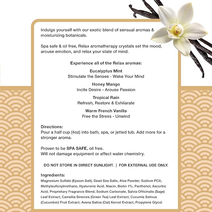 - MADE IN THE U.S.A. WITH SECURE SEAL: Proudly crafted with the highest quality ingredients by Relax Spa & Bath, our 17 oz Warm French Vanilla bath crystals ensures a luxurious experience, offering the finest salts and a comforting fragrance with every use. In addition, designed for convenience, our PRESS-LOK closure provides a secure, intuitive seal—simply press to lock for an airtight, spill-resistant, and effortless storage solution.