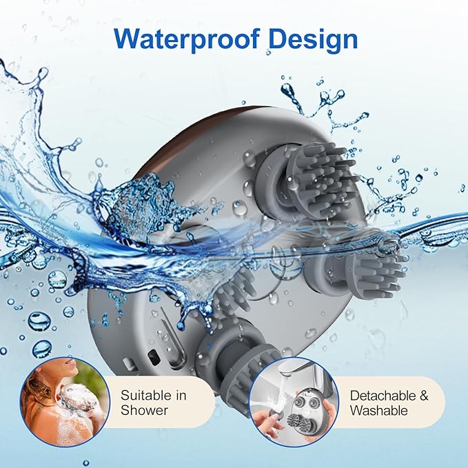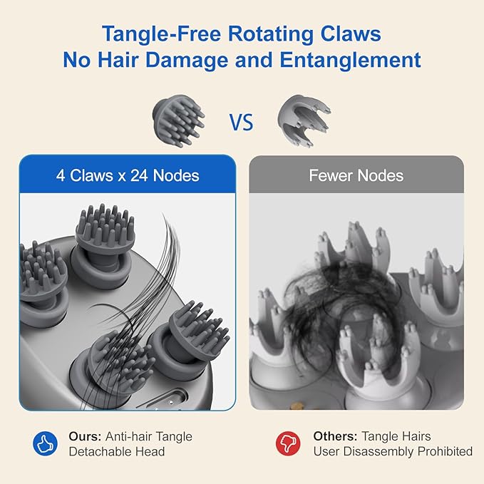 - Tangle-free removable silicone massage claws: the electric head massager is equipped with four silicone massage heads that avoid tangles and allow you to pinpoint specific areas for optimal results. The tapered design of the massage heads ensures a concentrated action, giving you tailored relaxation and deep comfort. Enjoy a steady and gentle massage that effectively reduces fatigue.