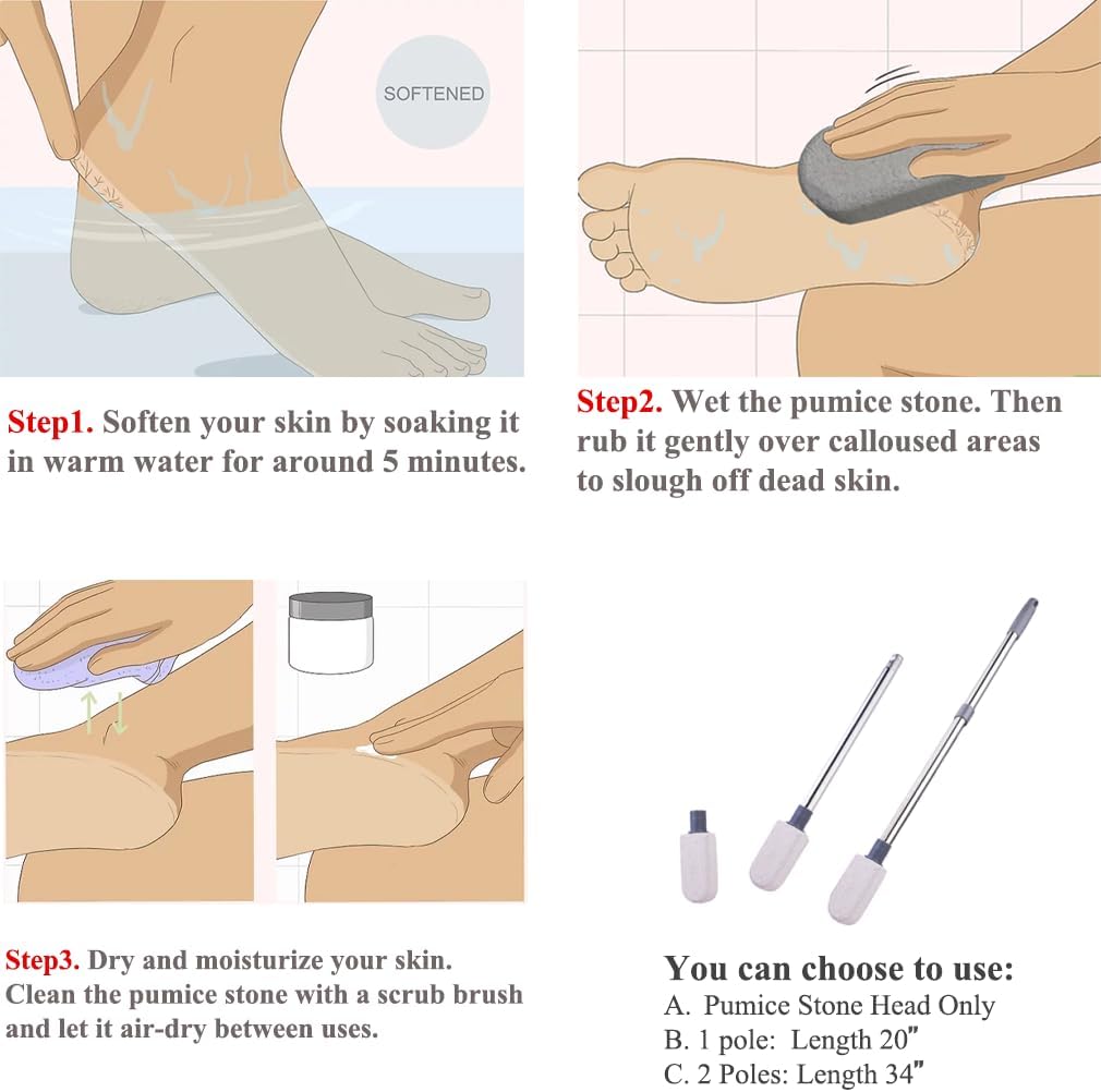 - 【Package List】You will receive 2 foot scrub pumice heads, 2 Stainless Steel Poles,1 User Manual. This foot scrub is an natural, effective tool to give you smooth, supple feet.