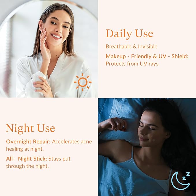 - Invisible Cover: These super-thin, clear pimple patches blend effortlessly with your skin, offering all-day comfort. They prevent picking and reduce the risk of infection, keeping your skin smooth and blemish-free. Ideal for use under makeup, they stay discreet whether worn during the day or overnight