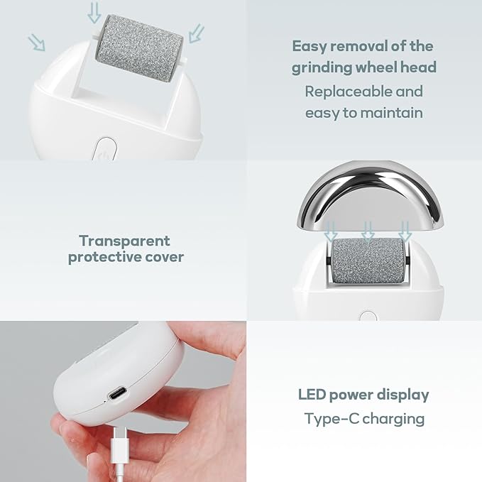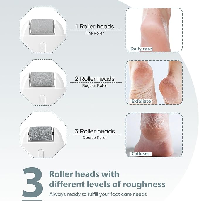 - 3 Replacement Foot Scrubber -- Foot Callus Remover has Equipped with three quartz crystal roller heads, the coarse grinding head can remove stubborn corneal dead skin, the medium grinding head can remove rough dead skin, and the fine grinding head is used for daily care. Pumice stone for feet can quickly interchangeable for different callus or dead skin removal needs.