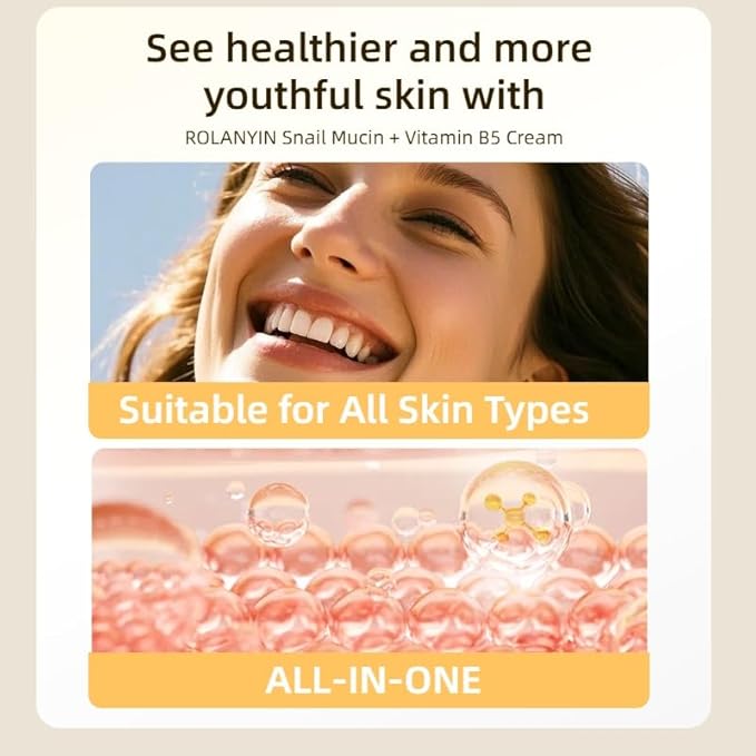 - Gentle for All Skin Types: ROLANYIN Snail Mucin + Vitamin B5 Cream is formulated with clean, cruelty-free ingredients, ensuring it is effective and gentle for all skin types, including sensitive skin.
