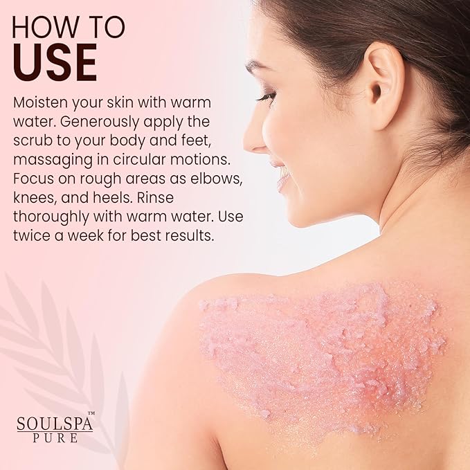 - Exfoliating Himalayan Salt: This exfoliating body scrub features natural Himalayan Pink Salt to gently exfoliate and remove dead skin cells for smooth, refreshed skin. Perfect for self-care routines and spa days. Nature powered body scrubs for women by SoulSpa Pure.