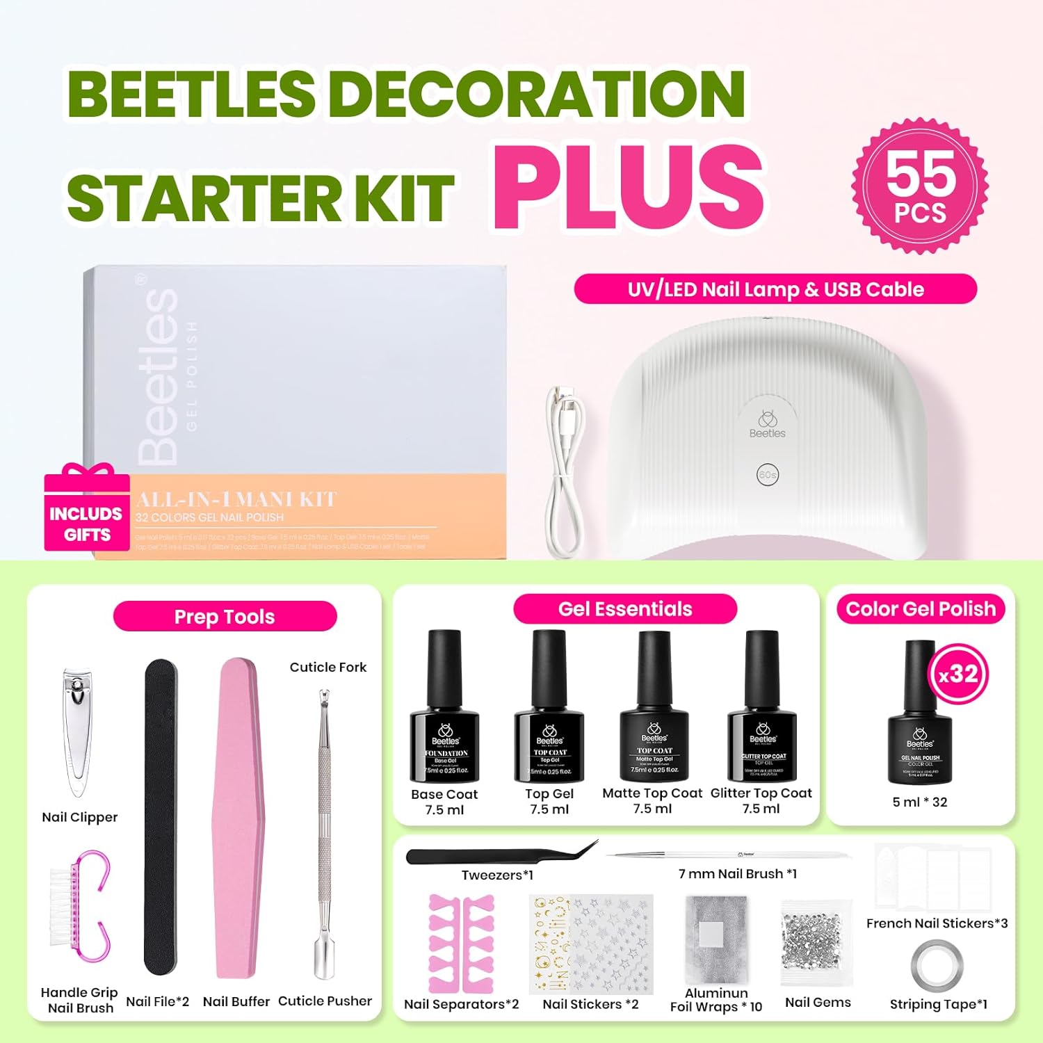Beetles Gel Nail Polish Kit with U V Light - 32 Colors Nail Kit 55 Pcs Gel Polish Set Four Seasons Glow Pro Base & Matte Glossy Top Coat Nails Stuff Soak Off DIY Art Set Gifts for Women Teen Girls
