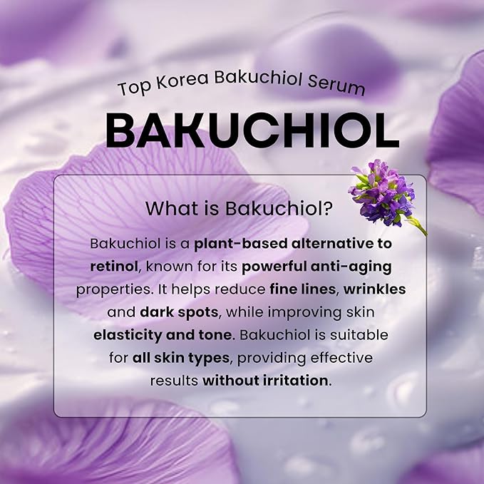 - BAKUCHIOL: GENTLE RETINOL ALTERNATIVE – Enjoy the benefits of a natural retinol alternative without irritation with Bakuchiol. It renews skin, reduces wrinkles, and enhances firmness without redness or peeling. Unlike retinol, it is not sensitive to sunlight, making it safe for both day and night use.