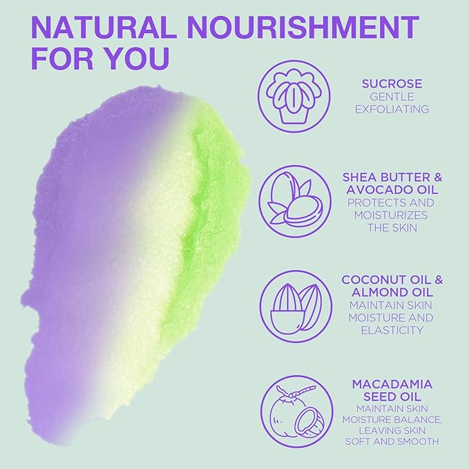 - NATURAL NOURISHMENT: Our Lavender Body Scrub is rich in natural nutrients such as Shea Butter, Coconut Oil, Vitamin E and Lavender Extract, which can effectively penetrate the skin, remove impurities, and deeply nourish, leaving skin burden-free, keeping it soft, smooth and youthful.