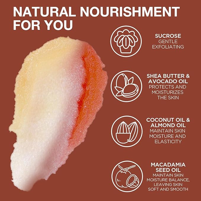 - NATURAL NOURISHMENT: Our Brown Sugar Body Scrub is enriched with natural nutrients such as Shea Butter, Coconut Oil and Vitamin E , which can effectively penetrate the skin, remove impurities, deeply nourish, leaving skin burden-free, soft, smooth and youthful.