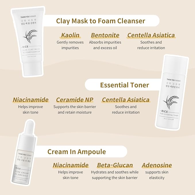THANKYOU FARMER Rice Pure Glow Travel Kit, Mini Size Cleanser(1.05 fl oz), Mini Size Toner(1.05 fl oz), Mini Size Ampoule(0.35 fl oz)